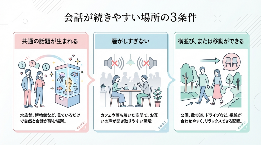 会話が得意な人ばかりではありません。だからこそ、話術だけで何とかするのではなく、場所の力を借りることが大切です。話題のきっかけが多い場所、沈黙が気まずくなりにくい場所、歩きながらでも成立する場所を選ぶだけで、会話の難易度はかなり下がります。