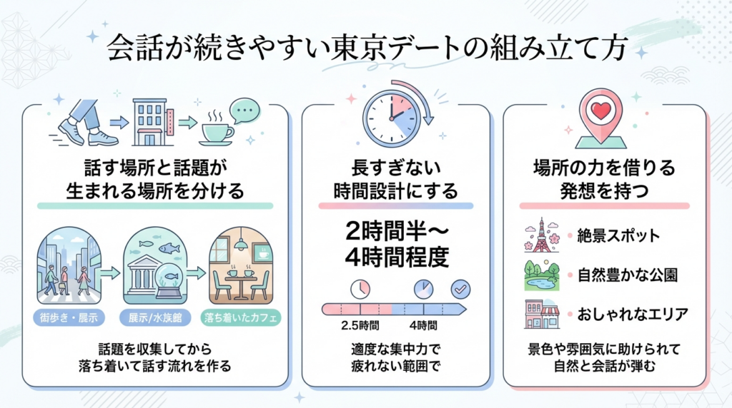 東京で会話が続きやすいデートスポットを選ぶときは、雰囲気の良さだけでなく、共通の話題が生まれるか、音環境が穏やかか、横並びや移動がしやすいかという視点を持つことが重要です。共同で何かを見る体験や、静かすぎず騒がしすぎない空間は、初期の関係ほど大きな意味を持ちます。